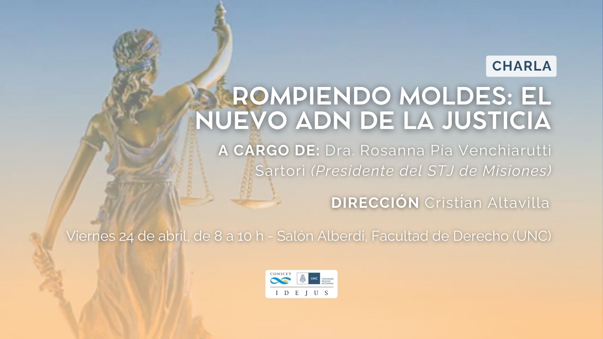El IDEJUS invita a la charla Rompiendo moldes: el nuevo ADN de la justicia, a cargo de la Dra. Rosanna Pía Venchiarutti Sartori, Presidente del STJ de Misiones. Día: 24/4, de 8 a 10h. Lugar: Salón Alberdi, Facultad de Derecho (UNC). INSCRIPCIONES