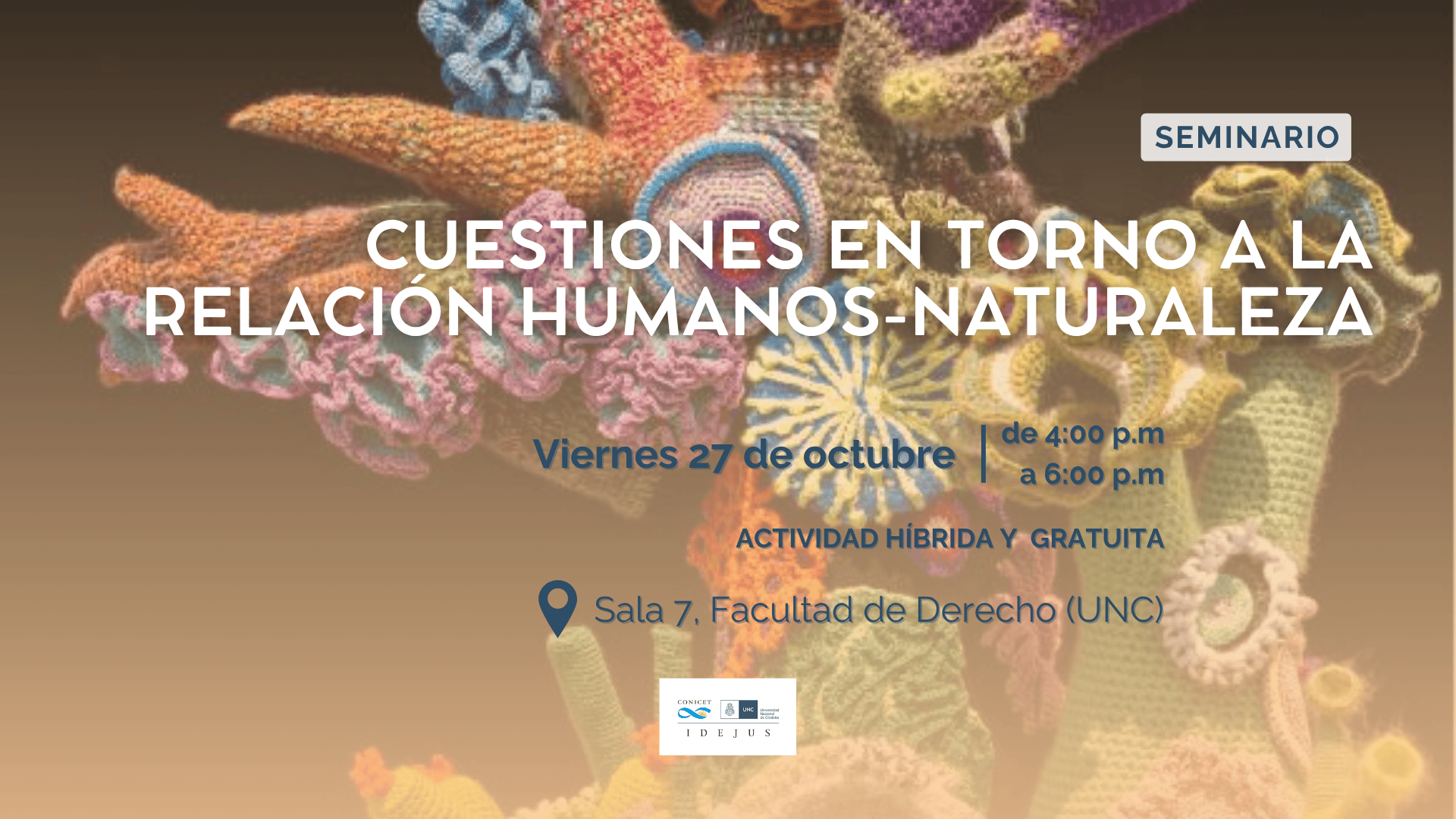 El IDEJUS invita a participar del Seminario "Cuestiones en torno a la relación Humanos-Naturaleza", organizado por el el IDEJUS (CONICET-UNC) en conjunto con el Grupo de Investigación "Derecho y Control", dirigido por Hernán Galo Bouvier y Paula Gastaldi . El mismo tendrá lugar del 27  de octubre, con modalidad híbrida. Inscripciones abiertas.